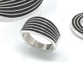 Edgeplate(エッジプレート)デザインは、厚いシルバーの板材、またはキャスト製法で作られた鋳造材の上に、blade(ブレード、薄い板材)を垂直に乗せて並べ、ロウヅケして作られます。できるだけ等間隔にブレードを並べ、ロウヅケの際にずれないようにすること、ロウヅケの跡が残らないようにすること等、技術的にも大変なものがあります。また、ブレスレット、リング他は、作品全体にアールをつけなければならないので、経験を積んだ熟練者でないと、エッジプレート作品をうまく作ることはできません。