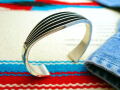 Edgeplate(エッジプレート)デザインは、厚いシルバーの板材、またはキャスト製法で作られた鋳造材の上に、blade(ブレード、薄い板材)を垂直に乗せて並べ、ロウヅケして作られます。できるだけ等間隔にブレードを並べ、ロウヅケの際にずれないようにすること、ロウヅケの跡が残らないようにすること等、技術的にも大変なものがあります。また、ブレスレット、リング他は、作品全体にアールをつけなければならないので、経験を積んだ熟練者でないと、エッジプレート作品をうまく作ることはできません。