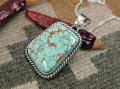 このペンダントは、ニューメキシコ州在住のあるターコイズ・コレクターの所蔵品の中から、私がカボション(石の部分)を選び、別注製作を依頼したものです。クラシック・ターコイズの代表格、ナンバーエイト・ターコイズらしい色合い、マトリックス(スパイダーウェブ)の入り方をお楽しみいただける、とても美しい石です。