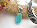 アメリカ産ターコイズの代表格、キングマン・ターコイズらしい透明感のあるブルー、細かい濃淡差のある微妙な色合いお楽しみ頂ける、とても美しい石です。 じっと見つめていると心が静かに癒されてくるような、神秘的な色の世界を日常のコーディネイトでお楽しみ下さい。 キングマン・ターコイズの石そのものが持つ、独特の色合いやマトリックスの美しさを生かす為に、ベゼルの装飾はシンプルな仕上がりになっています。 また、太目のチェーン、革紐や細いビーズ・ネックレス等にも通してご利用いただけるように、ベイル(bail、バチ管=チェーン通し)は内径が大きめのものをセットしています。 ナバホのリンダ・フレイザーさんが作る太目のハンドメイド・チェーン (別売り)と一緒に着けると、より一層グレードアップします。