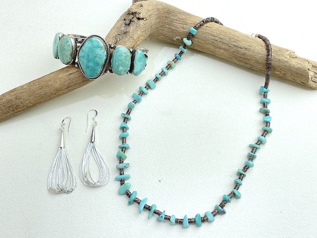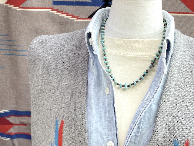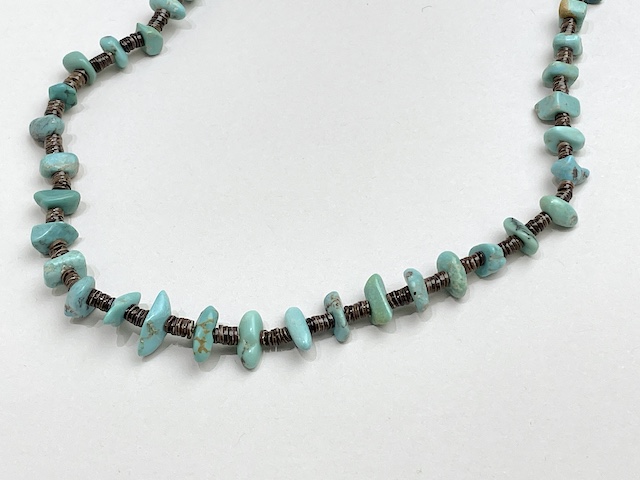 - 素材 : スタビライズド(無色の樹脂を加圧注入)加工されたキングマン・ターコイズのナゲットビーズ、ダーク・オリーブシェル