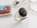 ズニ族出身の女性アーティスト、エイミー・ワイスレー(Amy Wesley)さんのチャネルインレイ・シャドーボックス・リングをブラックジェットに乗せ換えた、当店の別注・限定生産品です。 素材の色合いによって、指先が引き締まりますね。カジュアルウェアとのコーディネイトは勿論ですが、スーツファッションとの組み合わせにもお勧めします。