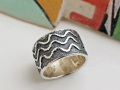 リング全体に施された模様は、水の流れや水面の波を表現しているのだそうです。年間降雨量が少ない乾燥した大地に住み続けるホピ・インディアンにとって、生きていく上で、また農作物を育てる為にも、水は非常に大切な物です。また、切れ目なく連続している模様は、永遠・永続製の象徴でもあるそうです。