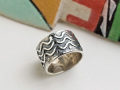 リング全体に施された模様は、水の流れや水面の波を表現しているのだそうです。年間降雨量が少ない乾燥した大地に住み続けるホピ・インディアンにとって、生きていく上で、また農作物を育てる為にも、水は非常に大切な物です。また、切れ目なく連続している模様は、永遠・永続製の象徴でもあるそうです。