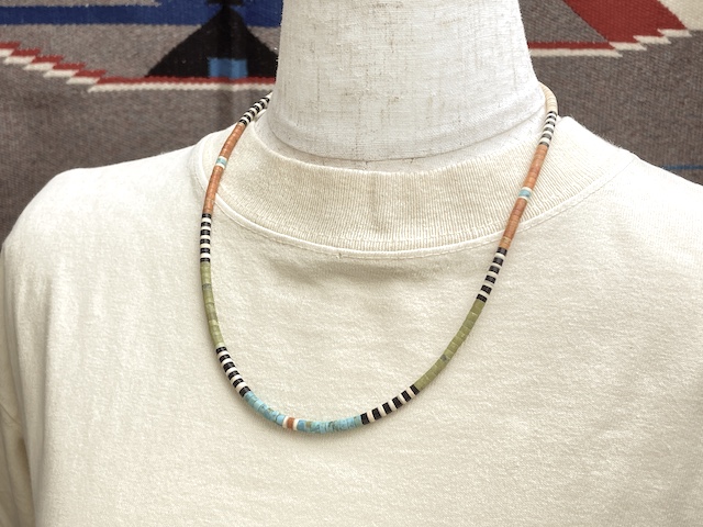 - 素材 : スタビライズド加工されたキングマン・ターコイズ(ブルー)、ブラックジェット(黒)、メロンシェル(明るいベージュ)、オレンジ・スパイニーオイスター(明るいまだらのオレンジ)、サーペンタイン(オリーブグリーン)