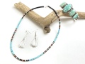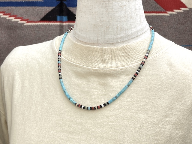 - 素材 : スタビライズド加工されたキングマン・ターコイズ(ブルー)、ブラックジェット(黒)、パイプストーン(赤茶)、メロンシェル(明るいベージュ)、クラムシェル(白)、サーペンタイン(オリーブグリーン)、レッド・スパイニーオイスター(濃い赤いまだら)