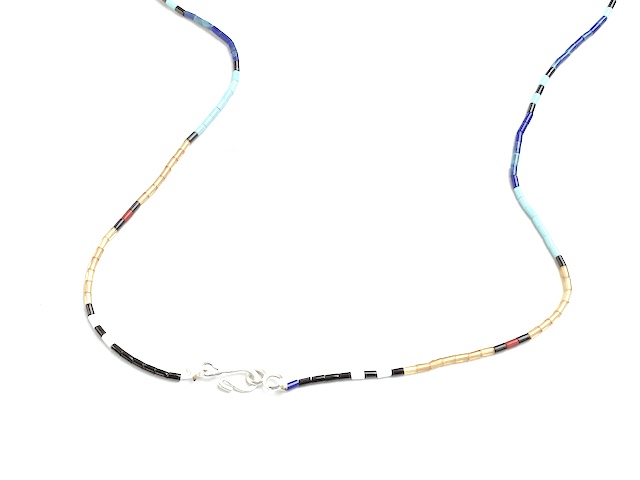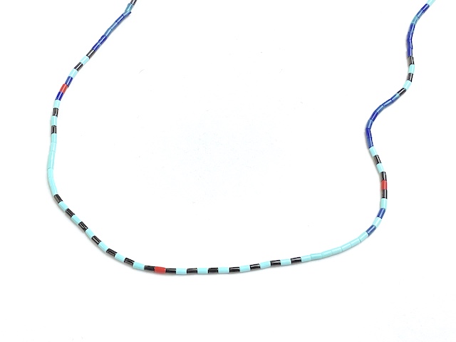 - 素材 : (全てスタビライズド加工された極小ビーズ) キングマン・ターコイズ(ブルー)、ブラックジェット(黒)、ラピスラズリ(ネイビーブルー)、クラムシェル(白いハマグリの貝殻)、赤サンゴ、アンバー(琥珀)