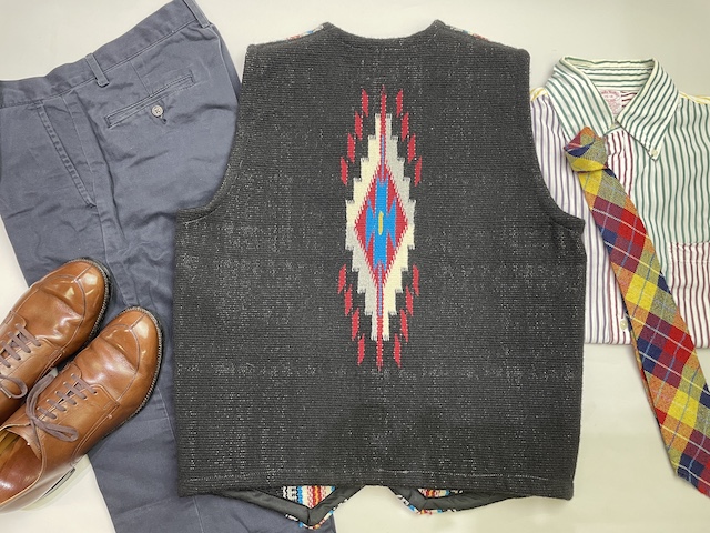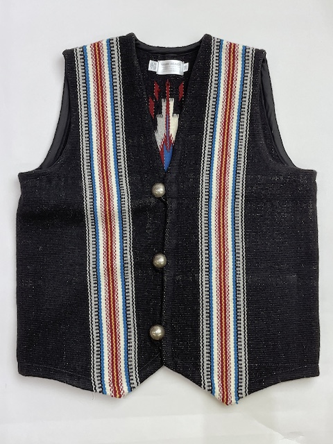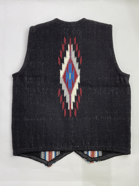 アメリカ合衆国の南西部を代表する伝統工芸品、手織りのウールブランケット、ベスト等で有名なニューメキシコ州チマヨ。その隣り村であるナンベ(Nambe)在住のガルシア夫妻による手織り、ハンドメイドのベストです。