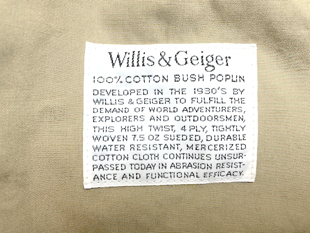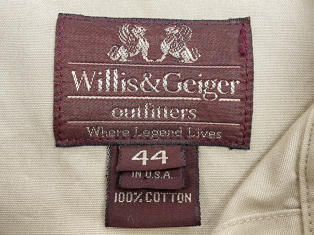 独特の気品と高品質を誇るサファリウェアやアウトドアウェアの雄 Willis & Geiger(ウィリス・アンド・ガイガー)、かつてのアメリカ製、340 Bush Poplin(ブッシュポプリン)素材のサファリジャケットです。