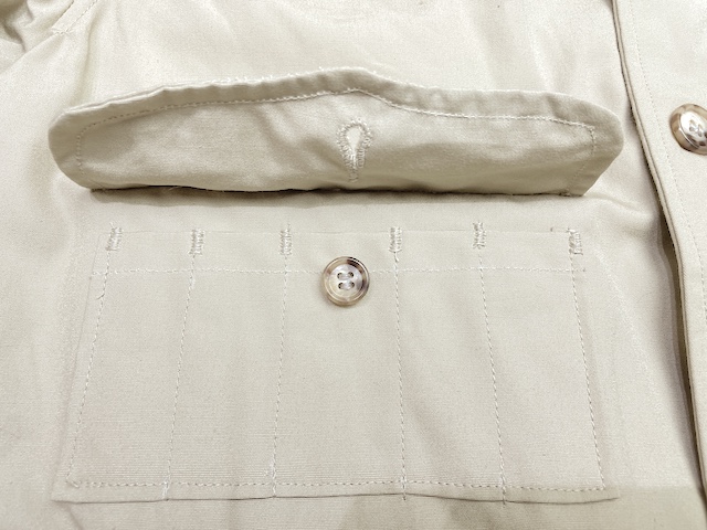 左の胸ポケットは、2重構造でマチがたっぷりの、ビノキュラー(双眼鏡)本体と2つのレンズカバー用ポケットです。フラップの留め位置は、ダブルボタンで調整可能です。