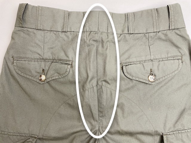 ウエストからお尻にかけてサイズ詰めを行なった跡がうっすらと残っていますが、ほとんど目立たず、着用にも問題はないと思われます。
