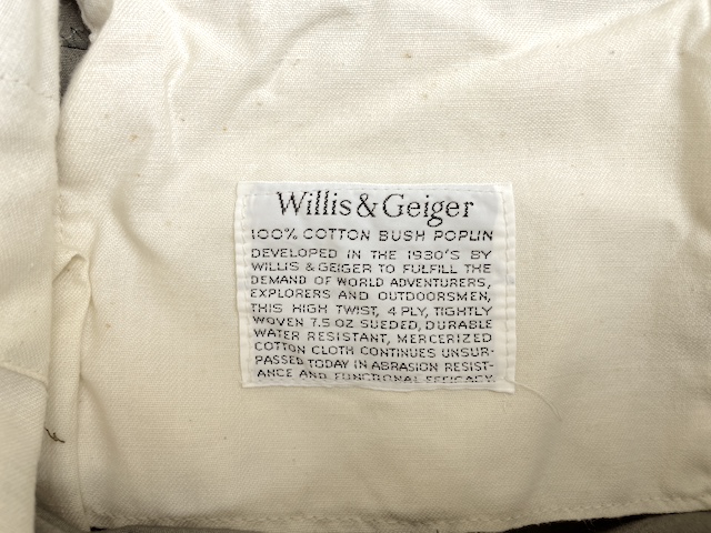 独特の気品と高品質を誇るサファリウェアやアウトドアウェアの雄 Willis & Geiger(ウィリス・アンド・ガイガー)、かつてのアメリカ製、340 Bush Poplin(ブッシュポプリン)素材のカーゴパンツです。