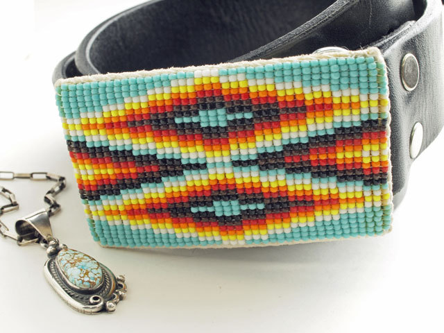 本体の芯となる金属板にディアスキン(鹿革)スエードが貼られていて、表のビーズ細工は丁寧に縫い付けられています。裏側は、ディアスキン・スエードがそのままの状態になっています。