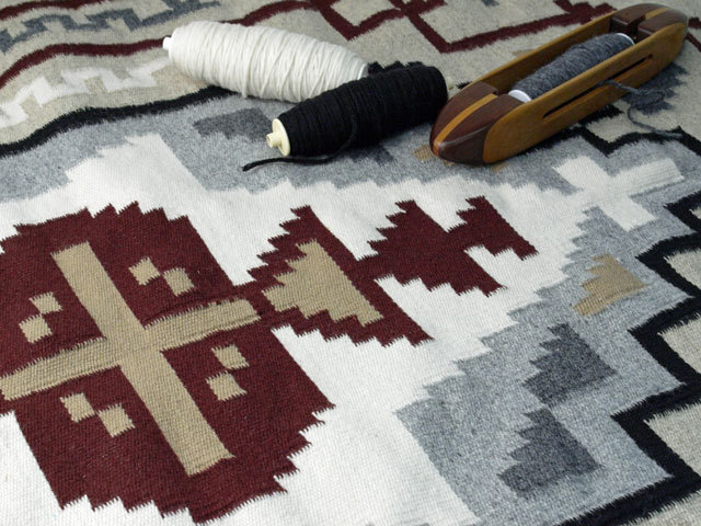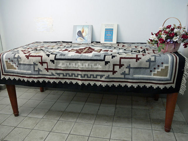 ナバホ族が織る代表的な『トゥー・グレイ・ヒル(Two Grey Hill)』デザインのヴィンテージに見られるような、大胆さと繊細さが混在するようなデザインをイメージして、現行のチマヨ・ブランケットとは全く違う雰囲気で織り上げた作品です。